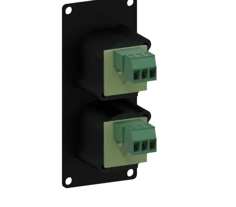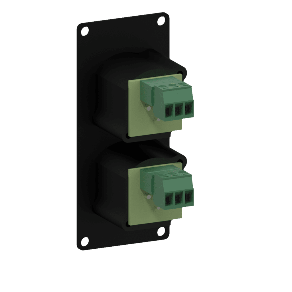Модуль CASY с двумя гнездовыми разъемами XLR на передней стороне и двумя клеммными колодками без пайки на задней стороне. Изготовлен из холоднокатанной стали 1,5 мм и покрыта порошковой краской черного цвета (RAL9004) устойчивой к царапинам.