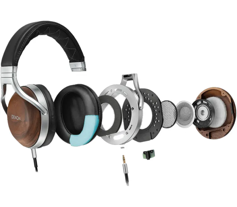 Чашки AH-D7200 изготовлены из массива американского ореха и закреплены на прочной металлической раме. Амбушюры наушников выполнены из пеноматериала с эффектом памяти и обтянуты особой искусственной кожей, отличающейся повышенной долговечностью. Что касается алюминиевого оголовья, то его внутренняя сторона покрыта такой же кожей, что и амбушюры, а внешняя – натуральной овчиной. Denon AH-D7200 комплектуются 3-метровым съёмным кабелем с проводниками из бескислородной меди OFC-7N и полноразмерным джеком для подключения к источнику звука.