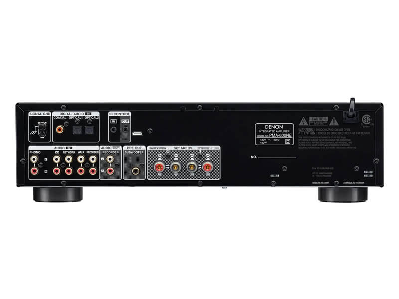 Усилитель Denon PMA-600NE оснащен четырьмя линейными входами, входом/выходом для подключения записывающего устройства. Имеется также вход для подключения проигрывателя виниловых дисков. Для подключения акустических систем служат две пары качественных винтовых клемм, к которым подходят и разъемы типа «банан». Предусмотрены также вход и выход для внешней системы дистанционного управления. Цифровая секция в усилителе Denon PMA-600NE представлена двумя оптическими и одним коаксиальным входами, которые способны принимать PCM сигнал с параметрами до 24 бит / 192 кГц. Имеет усилитель и Bluetooth-приемник, который поддерживает
