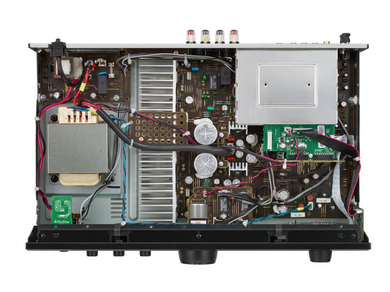 В блоке питания усилителя Denon PMA-600NE использованы фильтрующие конденсаторы повышенной мощности, и самостоятельные источники для отдельных функциональных узлов аппарата, а в наиболее важных с точки зрения качества звука цепях установлены отборные комплектующие. Усилитель собран на антирезонансном шасси с фирменной конструкцией Direct Mechanical Ground.