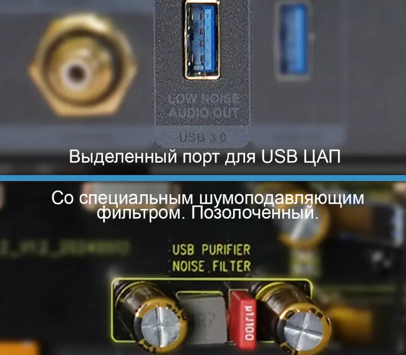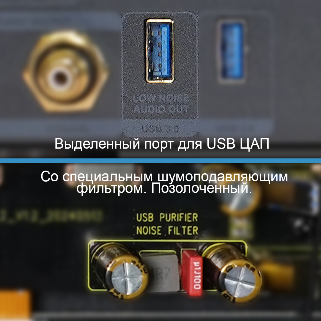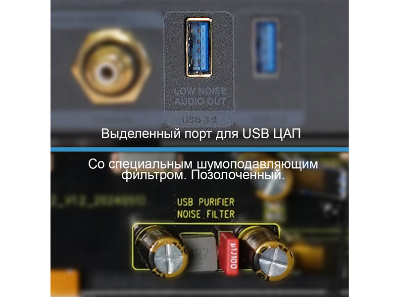 Для любителей аудио, которые предпочитают подключать внешний Hi-Fi USB ЦАП, один из USB-портов оптимизирован для подключения внешнего USB ЦАП. Этот USB-порт использует специальные компоненты для фильтрации электрических помех. Это помогает минимизировать проникновение помех от медиаплеера в USB ЦАП. Позолоченный разъем предотвращает окисление и обеспечивает качественный долговременный контакт.
