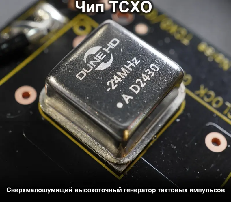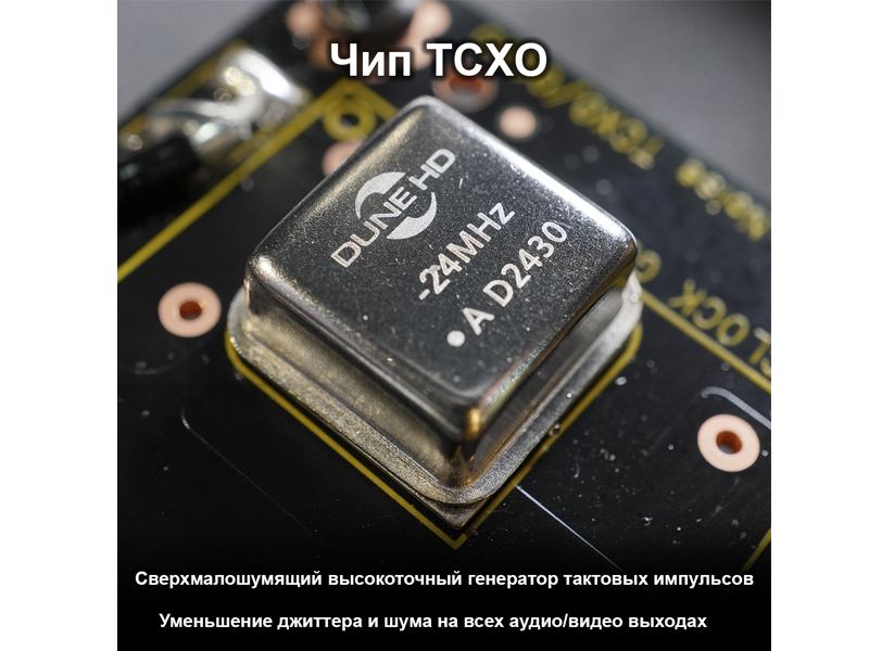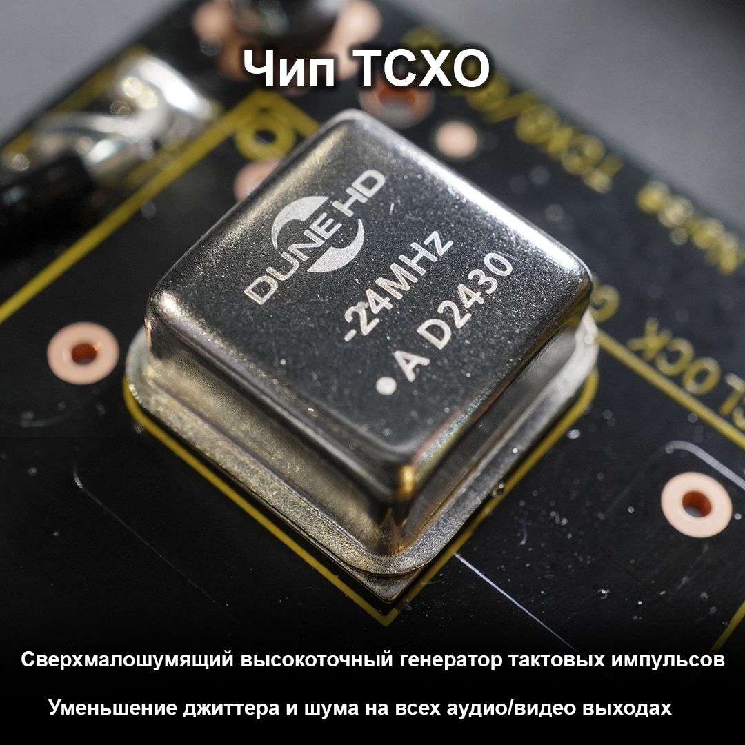 В медиаплеере установлен чип TCXO - сверхточный и сверхмалошумящий тактовый генератор с температурной компенсацией. Чип TCXO обеспечивает чистую и стабильную тактовую частоту (гораздо стабильнее обычной) для схем обработки аудио и видео в медиаплеере. Для чипа используется отдельная малошумящая схема питания. Это помогает дополнительно уменьшить джиттер и помехи на всех A/V-выходах и вывести качество звука и видео на еще более высокий уровень.