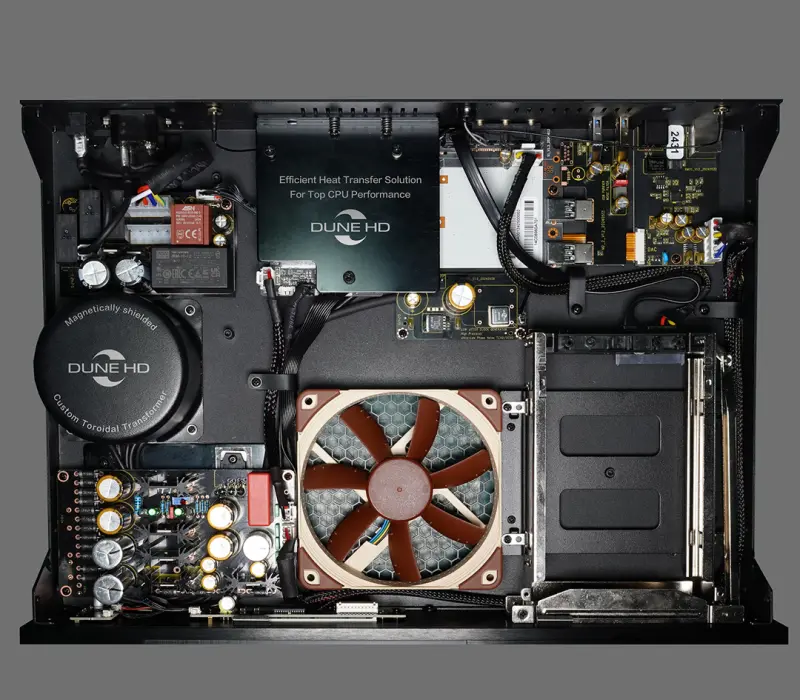 Линейный блок питания с магнитно-экранированным тороидальным трансформатором обеспечивает качественное и малошумящее питание для всех компонентов медиаплеера. Это помогает уменьшить джиттер и помехи на всех A/V-выходах, минимизировать передачу джиттера и помех от медиаплеера к принимающему A/V-оборудованию, что помогает обеспечить лучшее качество звука и видео.