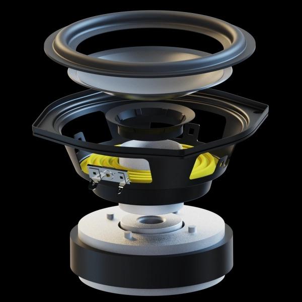 Новый цельный алюминиевый конус обеспечивает повышенную жесткость. В сочетании с увеличенным магнитом, звуковой катушкой большего диаметра и удлиненным полюсным наконечником эти улучшения обеспечивают более точное и динамичное воспроизведение басов.