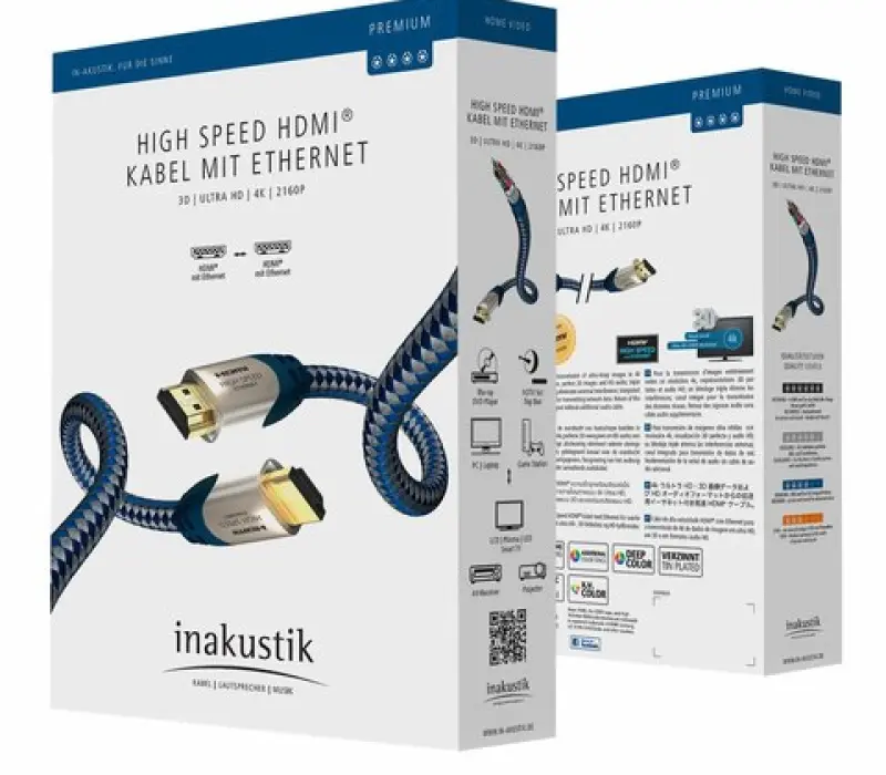 inakustik Кабель Prem II HDMIHDMI 5m EAN:4001985507597 Кабель High Speed HDMI с Ethernet, длина 5 метров, тройное экранирование, проводник из высокочистой меди OFC, поддерживает HDMI 2.0b, скорость передачи данных до 18 Гбит/с, 2160p 4K при 60/60 Гц, до 8 аудиоканалов (24 бит/192 кГц), HDR.