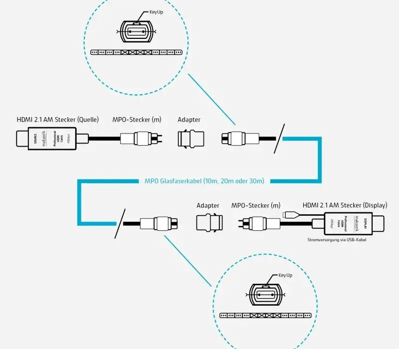 • Гибкое направление: адаптеры HDMI-MPO можно менять местами, чтобы изменить направление кабеля. Это значительно повышает гибкость установки и позволяет оптимально адаптироваться к различным условиям помещения.