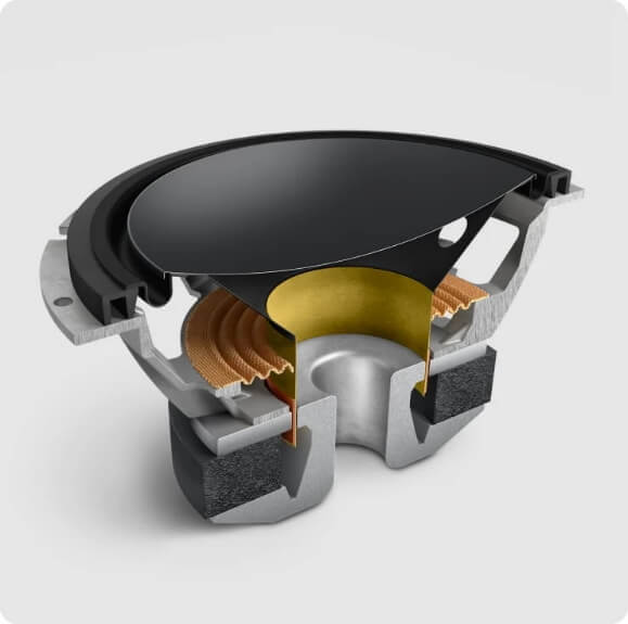 Бас – жизненно важный элемент производительности, и низкочастотные драйверы серии R были разработаны с особой тщательностью и точностью. Они построены с использованием конструкции из двух частей, где неглубокая вогнутая алюминиевая оболочка находится поверх бумажного конуса. Эта жесткость в сочетании с уникальной геометрией диффузора уменьшает нежелательные резонансы и обеспечивает поршневое движение, благодаря которому эти драйверы так хорошо работают. Магнитная система динамиков создает широкое однородное магнитное поле, а подвеска уменьшает гармонические искажения для чистого и точного звучания. В результате получается исключительно глубокий и подвижный бас, в котором раскрываются все мельчайшие детали и удары, доступные в басах.