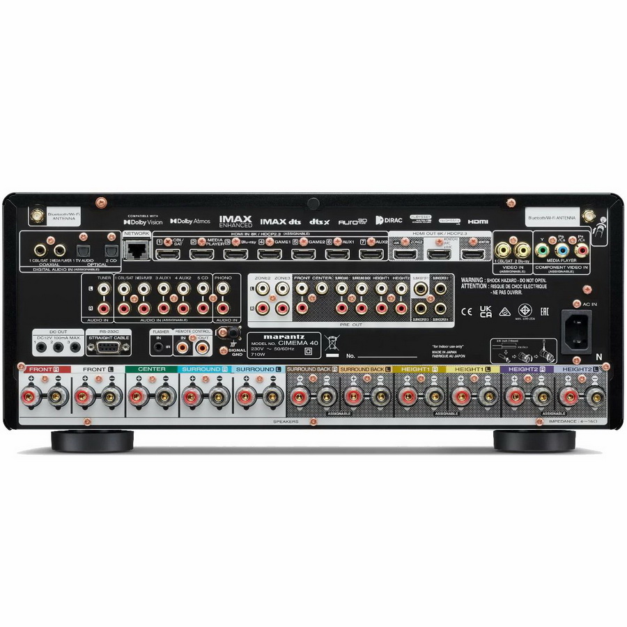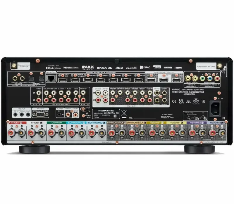 Одной из новых функций, появившихся в модели Marantz Cinema 40, является поддержка видео 8K на всех восьми HDMI-входах и трех выходах, а также 4K / 120 Гц, что наверняка оценят любители видеоигр. Также имеется возможность передачи видео с технологиями Dolby Vision, Dynamic HDR и HDR10+, а также поддержка HDCP 2.3. Предусмотрена возможность апскейлинга видео до разрешения 8K, а на HDMI-выходах имеется поддержка eARC, благодаря которой звук в форматах Dolby Atmos и DTS:X можно передавать от источников, подключенных к ТВ.