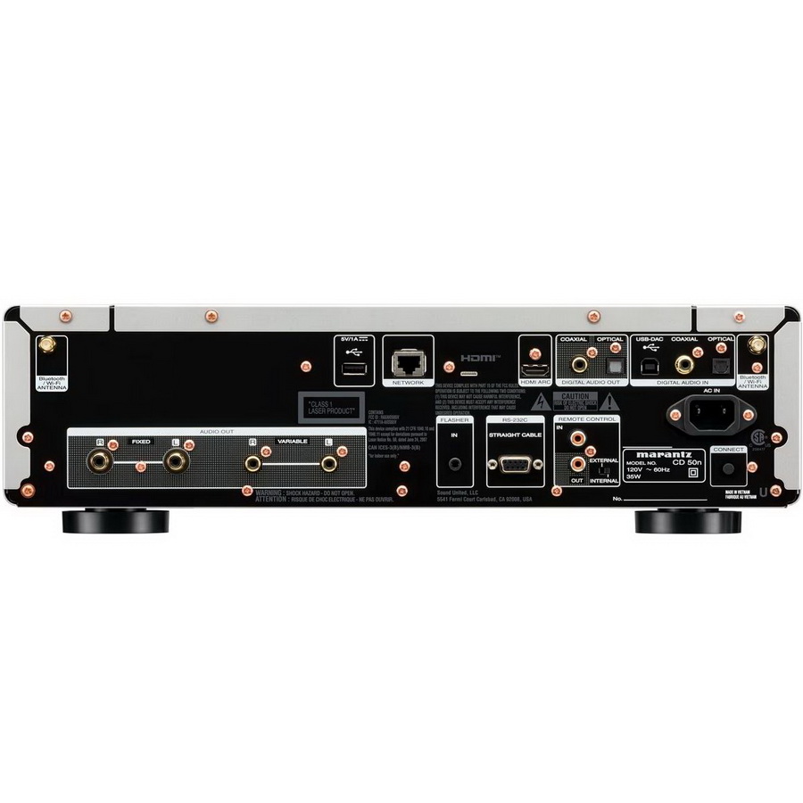 Marantz CD 50n оснащен ЦАП-ом аудиофильского класса с раздельными кварцевыми генераторами для двух частотных сеток. Аппарат обеспечивает воспроизведение High resolution аудио через USB-B вход с компьютеров PC или Mac. Поддерживается воспроизведение потока PCM с параметрами до 32 бит / 384 кГц или DSD 2,8/5,6/11,2 МГц. При этом, для устранения ВЧ-помех, которые могут проникать через этот интерфейс с компьютера, предусмотрена соответствующая защита.
