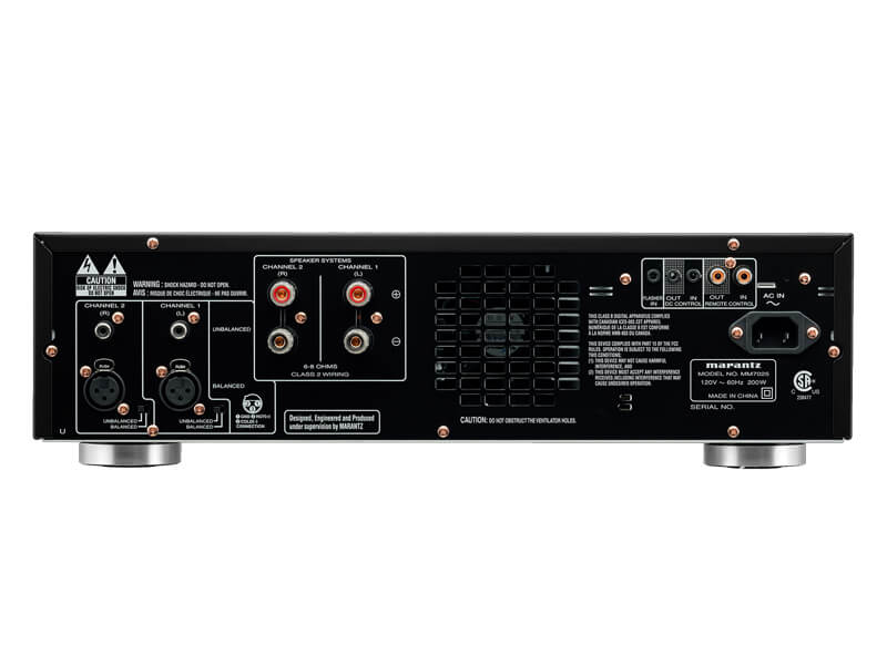 Усилитель Marantz MM7025 имеет следующие входы: балансный XLR и стандартный RCA, а также селекторы выбора между ними (для каждого канала). Есть ИК-порт, триггерные гнезда и разъемы для подключения по системной шине D-Sub, облегчающей управление оконечником в составе системы Marantz. Присутствуют две пары винтовых позолоченных терминалов для подсоединения акустических систем. Аппарат можно использовать в сочетании с многоканальными усилителями - MM7055 и MM8003.