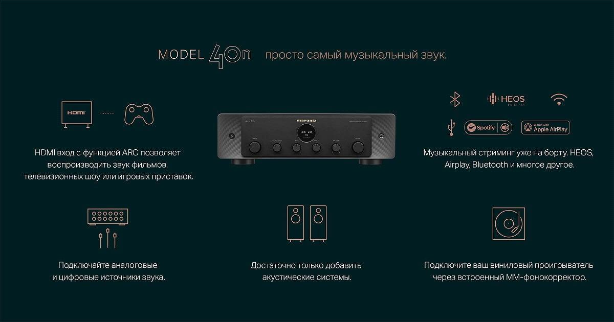 Богатая история Marantz содержит множество знаковых усилителей, и модель 40n идеально вписывается в это наследие. Да, он великолепен на вид в черном или серебристо-золотом исполнении, но еще более привлекательным является то, как он сочетает в себе этику бренда, ориентированную на производительность, с головокружительным набором функций. Потоковая передача цифровой музыки через платформу HEOS, подключение проигрывателя к входу MM phono или подключение телевизора через HDMI ARC - модель 40n одинаково хорошо воспроизводит аналоговую или цифровую музыкальную коллекцию, а также поднимает на новую высоту телевизионные и киноразвлечения. Тот, кто ищет современный, универсальный интегральный усилитель с превосходным звучанием, найдет его здесь.