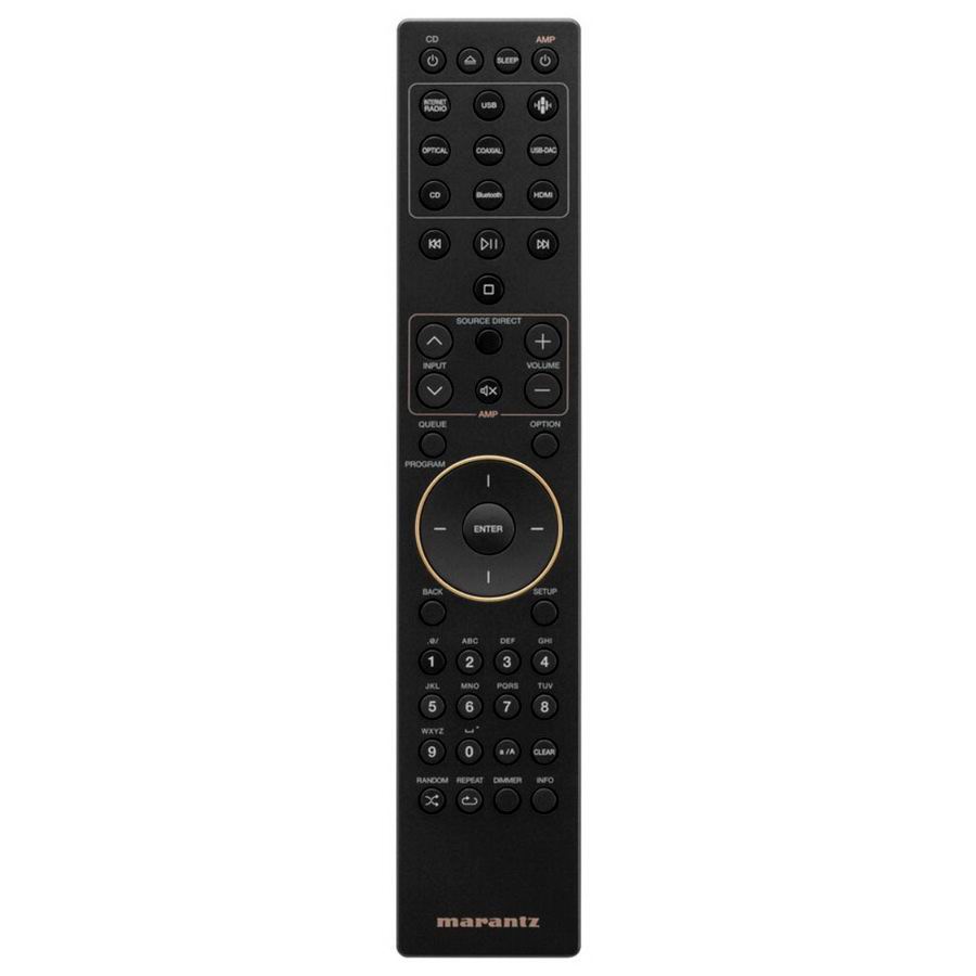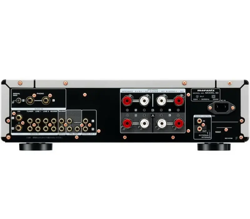 Выход на динамики оснащен оригинальным разъемом динамика Marantz (SPKT-1+). Сердечник цельный и вырезан из твердой латуни, и в результате прослушивания при обработке поверхности используется один толстый слой никелирования вместо традиционных двух слоев никелевой основы + золотого покрытия. Совместим с кабелями диаметром до 4,5 мм и надежно фиксируется большими винтами. Также совместим с Y-образными наконечниками и штекерами типа «банан». Входные и выходные клеммы позолочены для предотвращения износа с течением времени. Обеспечивает качественные соединения, которые прослужат долгое время. Кроме того, вход CD и вход Phono оснащены прочными разъемами RCA, изготовленными из обработанной латуни.