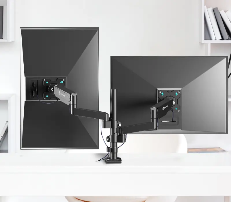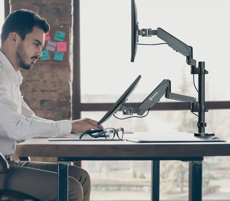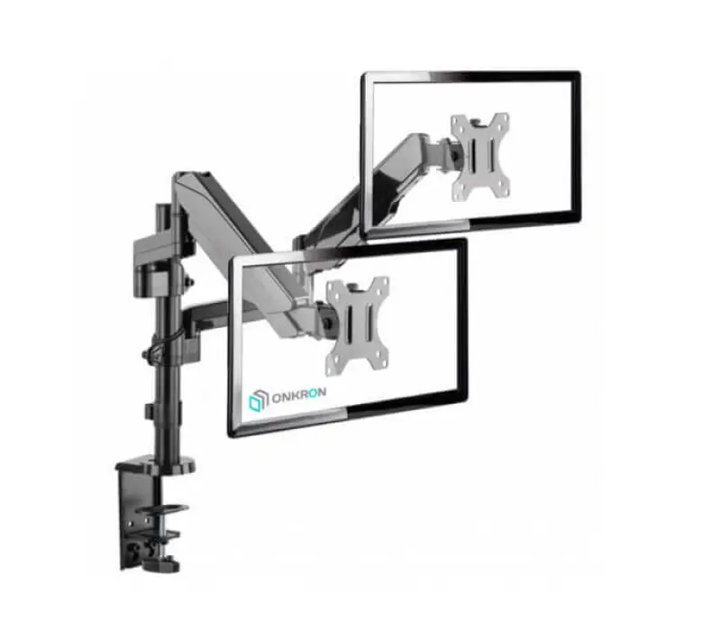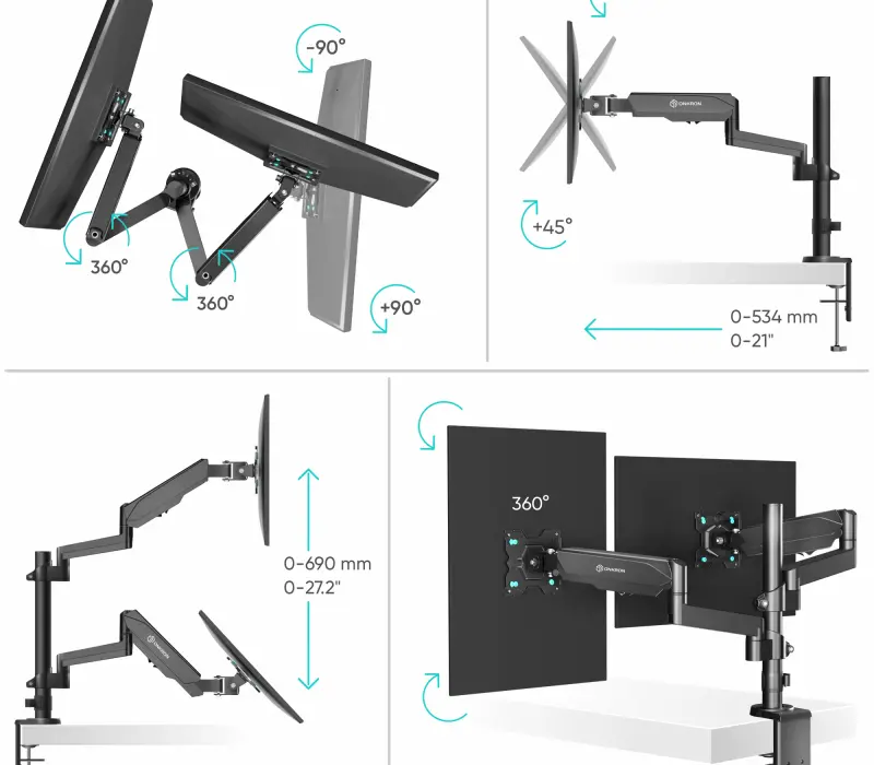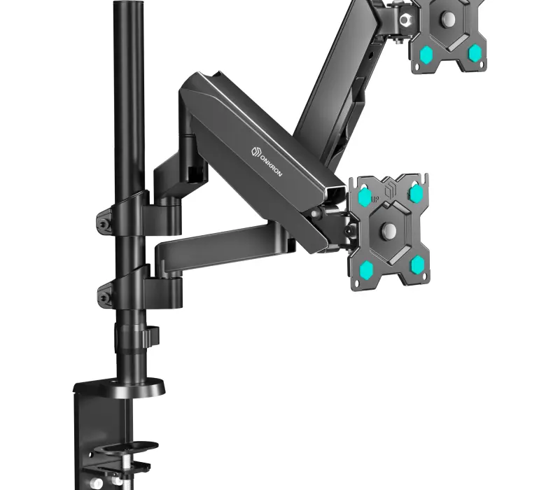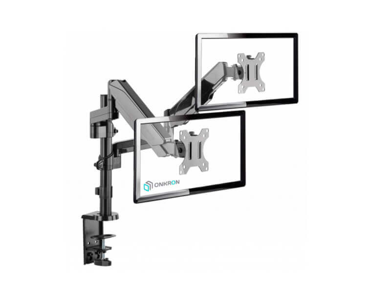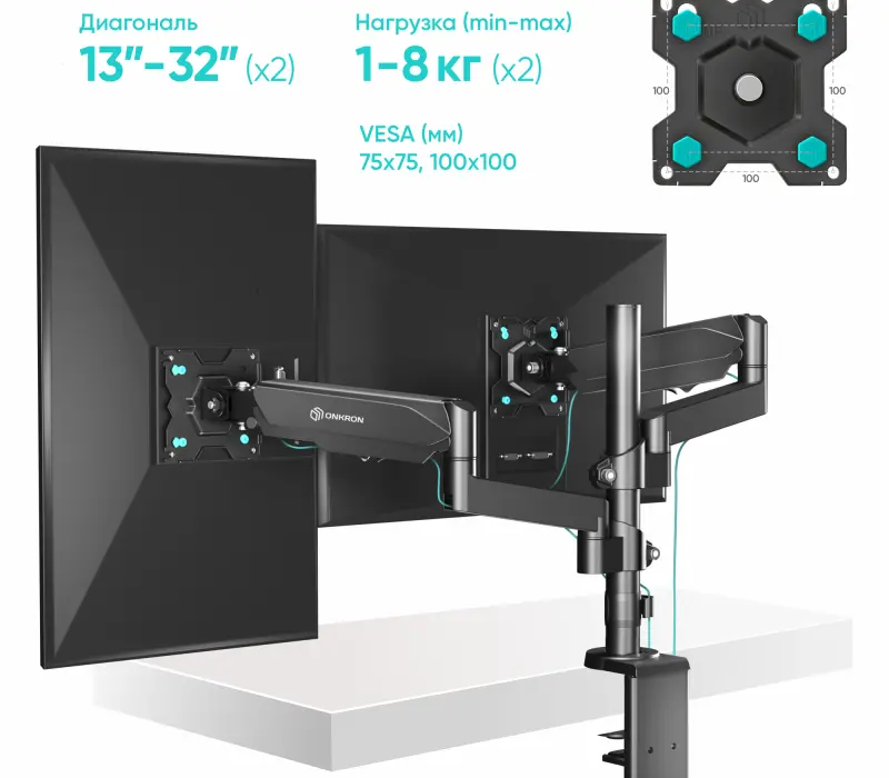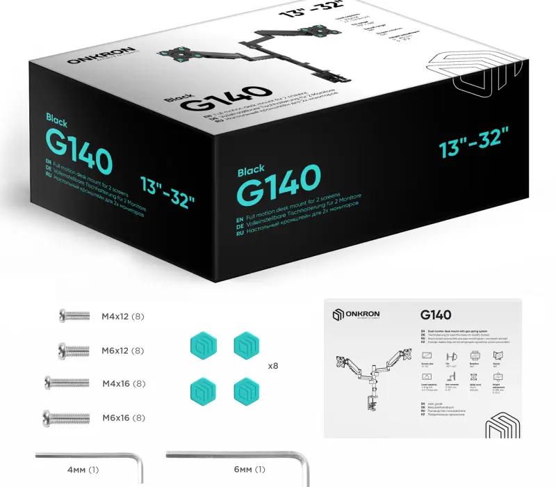 Настенный наклонно-поворотный кронштейн для двух мониторов, выполненный по технологии газлифт, ONKRON G140 подходит для мониторов и телевизоров диагональю от 13 до 32 дюймов (33 – 81,36 см) и весом до 8 кг на каждый.