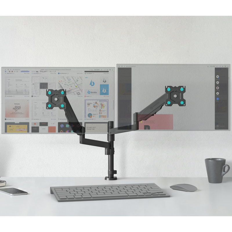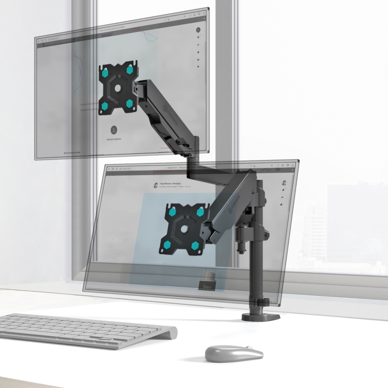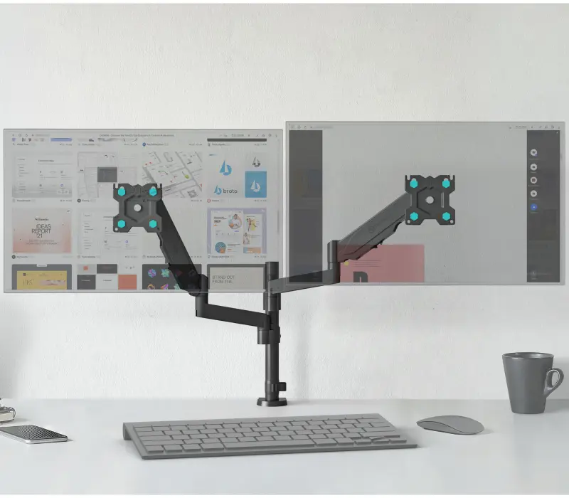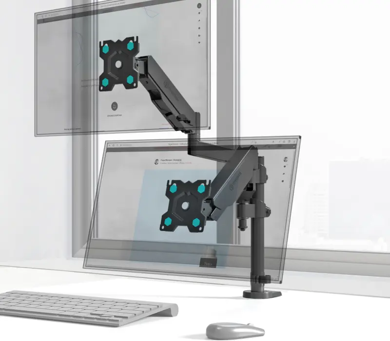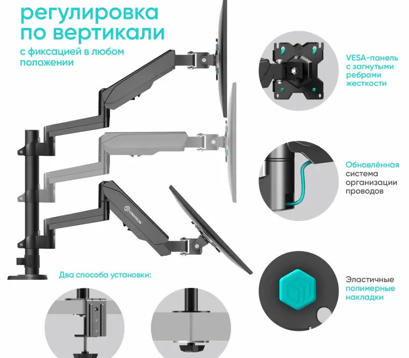 Механизм с возвратной пружиной и газовым амортизатором, располагающийся внутри корпуса кронштейна, даст возможность легко перемещать монитор в любую нужную вам позицию. Производитель предусмотрел два способа крепления кронштейна. Надежная струбцина позволяет крепить кронштейн на край стола. В комплекте также поставляется механизм, позволяющий крепить кронштейн через отверстие в столешнице.