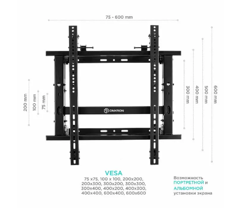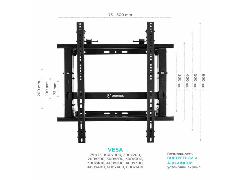 Производитель предусмотрел совершенно различные варианты крепления VESA:75 x75, 100x100, 200х200, 200х300, 300х200, 300х300, 300x400, 400x200, 400x300, 400х400, 600x400, 600x600 мм. Широкий выбор делает максимально удобным подбор размещаемой панели.