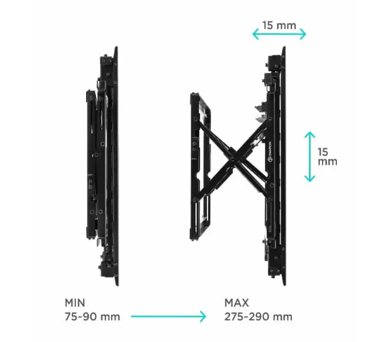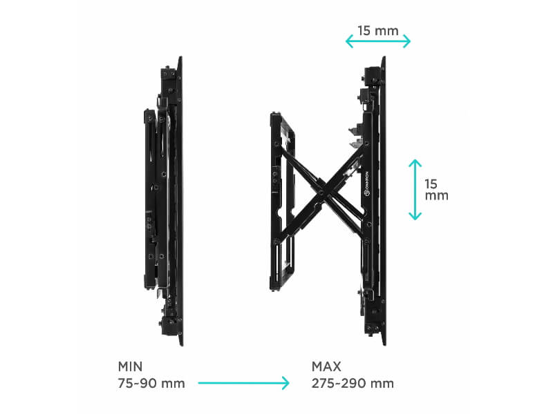 Вылет от стены в сложенном виде составляет 75~90 мм, в разложенном достигает 270~285 мм. Широкий диапазон позволяет выдвинуть панель на комфортное для глаз расстояние