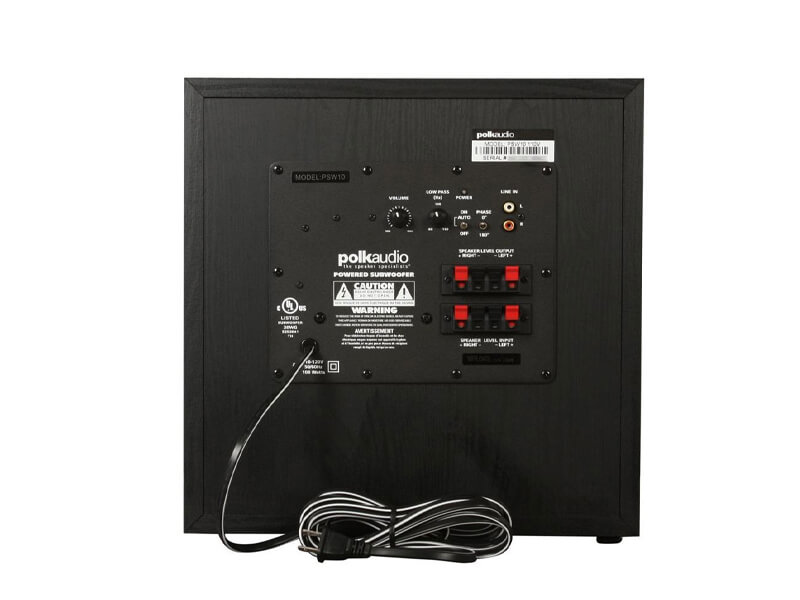 На задней панели Polk Audio PSW10 разместились порты подключения сателлитов и широкого спектра совместимых воспроизводящих устройств. Тут пользователь найдет колесико механической регулировки громкости и кабель подключения питания от электросети 220V. Для отведения излишков тепла, на задней панели была размещена металлическая пластина.