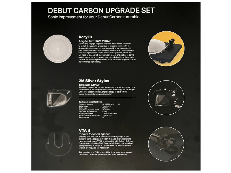 Если вы хотите улучшить качество звука вашего проигрывателя Pro-Ject Debut Carbon, этот набор аксессуаров может стать простым решением. Замена пластины не требует специального опыта, а установка очень проста. При замене стандартного картриджа (первоначально поставляемого компанией Ortofon 2M-Red) на более качественный 2M-Silver требуется точная регулировка и центровка. Звуковое улучшение действительно ощутимо. В этом случае установка VTA it требует специальных знаний по регулировке рычага, поэтому её должен выполнять опытный специалист. Несанкционированная установка аннулирует гарантию на проигрыватель.