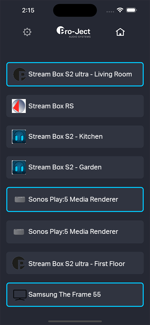 Используйте приложение Pro-Ject Control, чтобы выбрать, куда вести трансляцию. А после этого просто используйте кнопку «Управление потоком» сбоку, чтобы снова начать воспроизведение на ранее выбранном стримере.