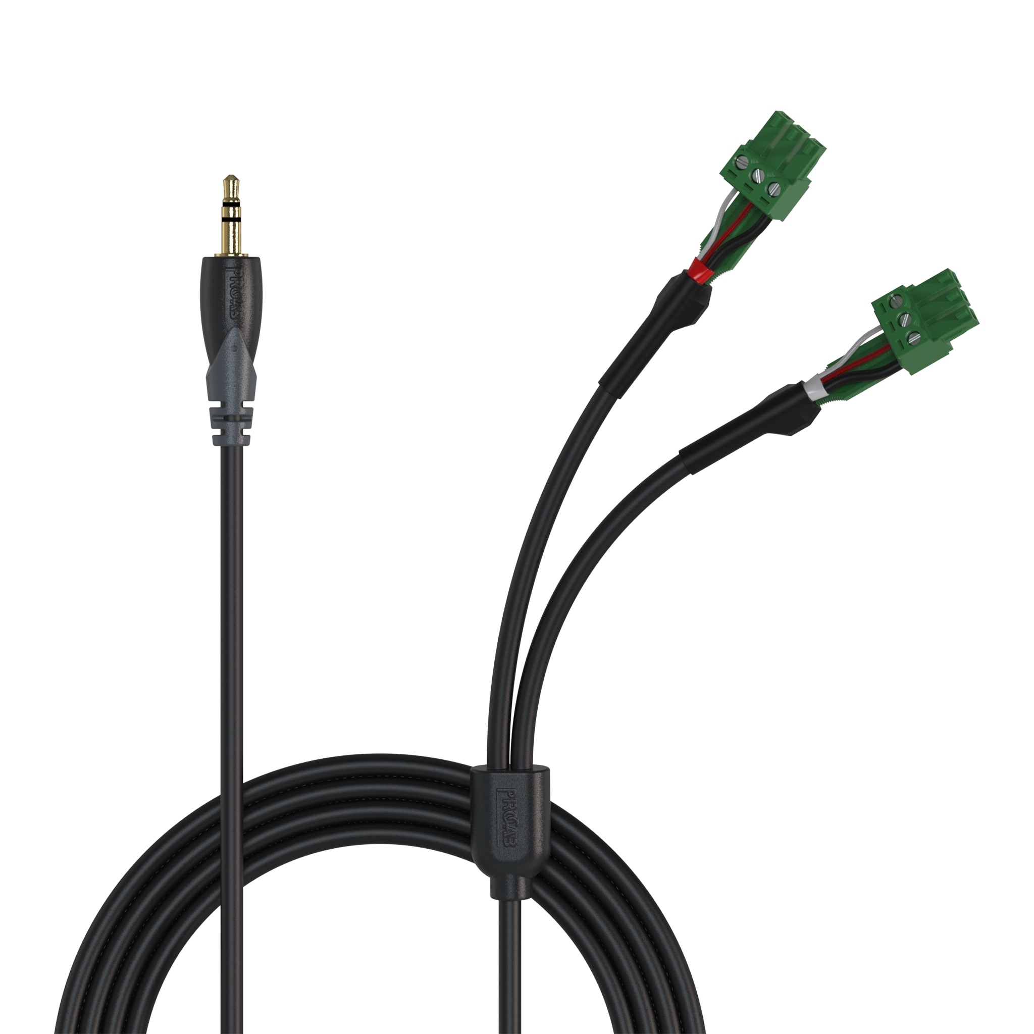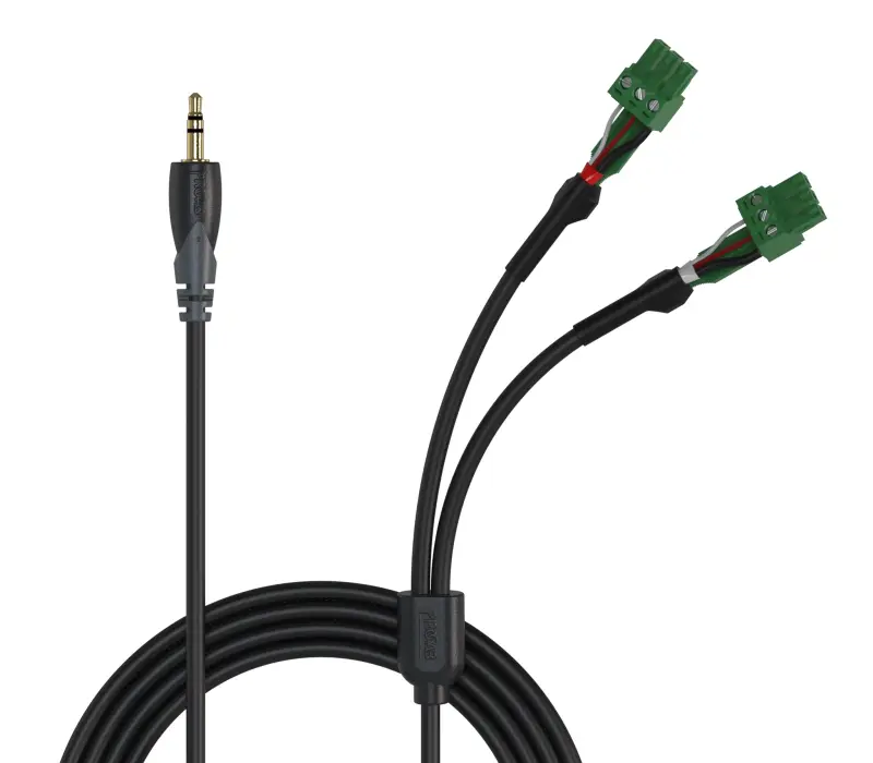 Этот кабель с его клеммными колодками специально разработан для того, чтобы облегчить установку стоек и ускорить сложные установки. Оснащенный пластиковой рукояткой для легкого подключения и отключения, этот сигнальный кабель имеет 3,5-мм стереоразъем для 2 x клеммной колодки (3-полюсная клеммная колодка с шагом 3,81 мм). Этот кабель может использоваться для подключения сигнала линейного уровня от портативных устройств с разъемом 3,5 мм к профессиональным устройствам с балансными клеммными колодками, таким как матрицы и профессиональные усилители аудиобренда AUDAC (и других)