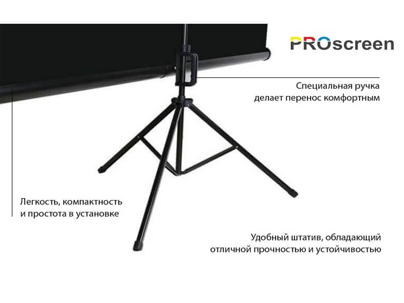 Легкость, компактность и простота в установке выгодно выделяют экран для проекторов PROscreen TLZ1084 среди конкурентов. Он позволяет полностью подготовиться к проведению презентации в течение нескольких минут, сделав её предельно информативной и наглядной.