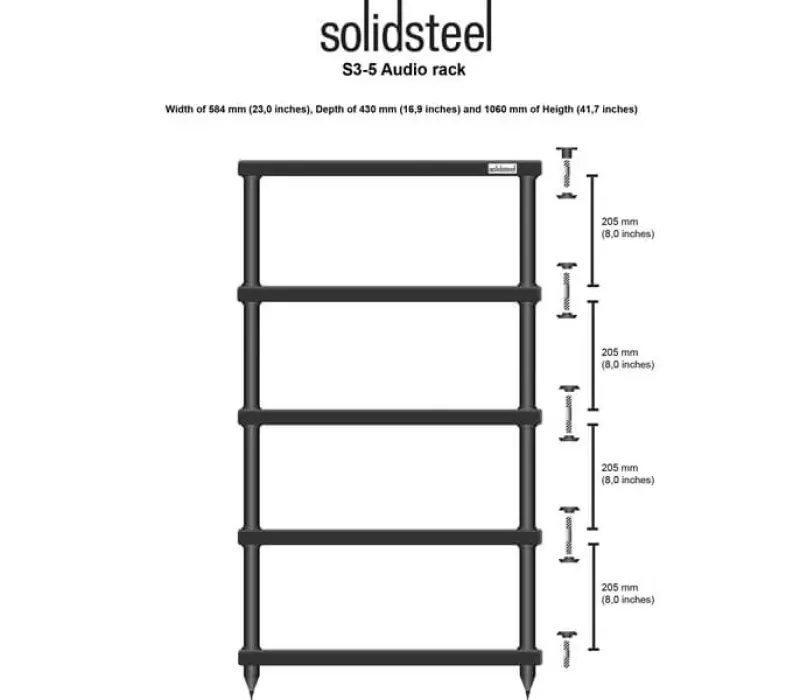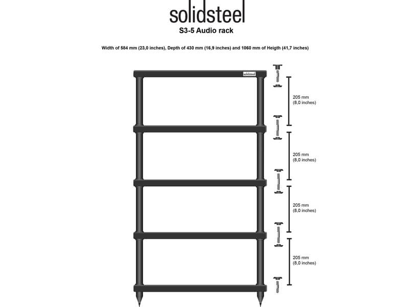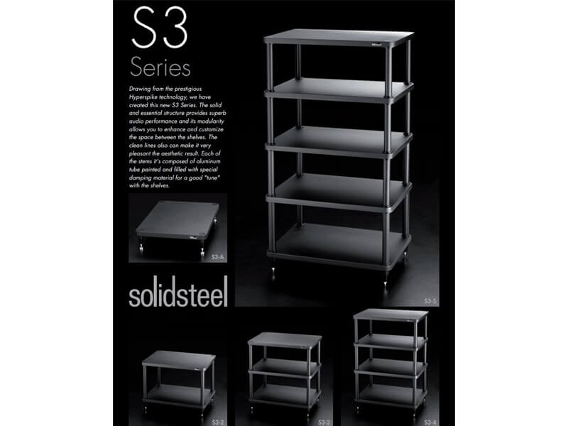 Solidsteel S3-4 представляет собой стойку для различного аудио-видео оборудования Hi-Fi. Она позволит прочно зафиксировать ваши устройства на поверхности, а антирезонансные опоры обеспечат защиту от вибраций. Стойка имеет 4 полки с расстоянием между полками 205 мм.