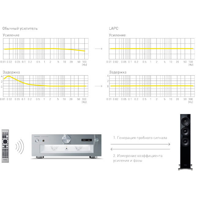 Сопротивление динамика изменяется в зависимости от частоты, и для управления им требуется усилитель мощности, не зависящий от характеристик динамика. Однако обычные цифровые усилители подключаются к динамикам через фильтр низких частот в выходном каскаде, поэтому на них еще сильнее влияют характеристики импеданса динамика. И хотя благодаря использованию отрицательной обратной связи амплитудные характеристики обычных усилителей были улучшены, фазовые характеристики улучшить не удалось. Поэтому мы разработали алгоритм адаптивной оптимизации импеданса динамика, выполняющий коррекцию идеальной импульсной характеристики с помощью цифровой обработки сигнала путем измерения частотно-амплитудно-фазовых характеристик усилителя с подключенными динамиками. Новый метод позволяет сгладить частотные характеристики амплитуды и фазы и обеспечить богатую пространственную выразительность звучания, чего ранее не удавалось достичь с помощью усилителей.