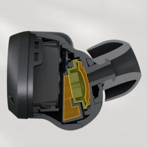 Тщательно продуманная форма соответствует канавке раковины чуть выше ушного отверстия, обеспечивая удобную и надежную посадку.