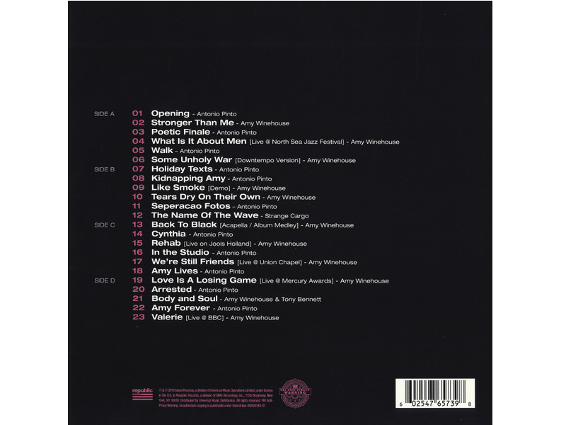 A1 Antonio Pinto– OpeningA2 Amy Winehouse– Stronger Than MeA3 Antonio Pinto– Poetic FinaleA4 Amy Winehouse– What Is It About Men (Live @ North Sea Jazz Festival)A5 Antonio Pinto– WalkA6 Amy Winehouse– Some Unholy War (Downtempo Version)B1 Antonio Pinto– Holiday TextsB2 Antonio Pinto– Kidnapping AmyB3 Amy Winehouse– Like Smoke (Demo)B4 Amy Winehouse– Tears Dry On Their OwnB5 Antonio Pinto– Seperacao FotosB6 Strange Cargo– The Name Of The WaveC1 Amy Winehouse– Back To Black (Acapella / Album Medley)C2 Antonio Pinto– CynthiaC3 Amy Winehouse– Rehab (Live On Jools Holland)C4 Antonio Pinto– In The StudioC5 Amy Winehouse– We're Still Friends (Live @ Union Chapel)C6 Antonio Pinto– Amy LivesD1 Amy Winehouse– Love Is A Losing Game (Live @ Mercury Awards)D2 Antonio Pinto– ArrestedD3 Amy Winehouse, Tony Bennett– Body And SoulD4 Antonio Pinto– Amy ForeverD5 Amy Winehouse– Valerie (Live @ BBC)