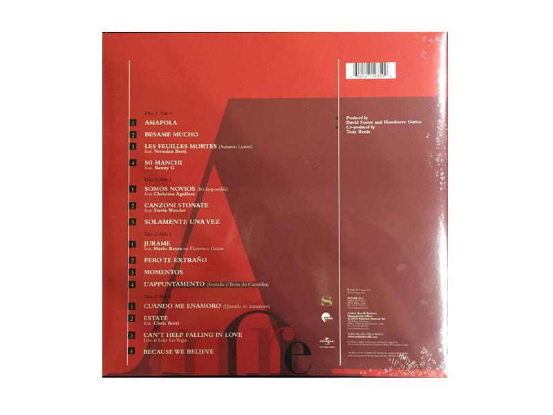 A1 Andrea Bocelli – Amapola 3:41A2 Andrea Bocelli – Besame Mucho 4:01A3 Andrea Bocelli Feat. Veronica Berti – Les Feuilles Mortes (Autumn Leaves) 4:50A4 Andrea Bocelli Feat. Kenny G (2)– Mi Manchi 3:34B1 Andrea Bocelli Feat. Christina Aguilera – Somos Novios (It's Impossible) 4:22B2 Andrea Bocelli Feat. Stevie Wonder – Canzoni Stonate 5:23B3 Andrea Bocelli – Solamente Una Vez 3:29C1 Andrea Bocelli Feat. Mario Reyes (2) – JurameFlamenco Guitar – Mario Reyes (2) 3:21C2 Andrea Bocelli – Pero Te Extraño 4:07C3 Andrea Bocelli – Momentos 3:54C4 Andrea Bocelli – L'appuntamento (Sentado A 'Beira Do Caminho) 4:06D1 Andrea Bocelli – Cuando Me Enamoro (Quando M' Innamoro) 3:55D2 Andrea Bocelli Feat. Chris Botti – Estate 3:41D3 Andrea Bocelli – Can't Help Falling In Love (Live At Lake Las Vegas) 3:24D4 Andrea Bocelli – Because We Believe 4:39