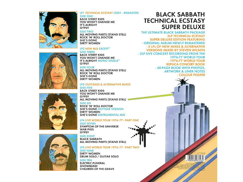 Technical Ecstasy Technical Ecstasy (2021 - Remaster)A1 Back Street KidsA2 You Won't Change MeA3 It's AlrightA4 GypsyB1 All Moving Parts (Stand Still)B2 Rock 'n' Roll DoctorB3 She's GoneB4 Dirty WomenTechnical Ecstasy • New Mix New Mix Except C1 Back Street KidsC2 You Won't Change MeC3 It's Alright (Mono Single*)C4 GypsyD1 All Moving Parts (Stand Still)D2 Rock 'n' Roll DoctorD3 She's GoneD4 Dirty WomenTechnical Ecstasy • Outtakes & Alternative Mixes Outtakes & Alternative MixesE1 Back Street KidsE2 You Won't Change MeE3 GypsyE4 All Moving Parts (Stand Still)F1 Rock 'n' Roll DoctorF2 She's Gone (Outtake Version)F3 Dirty WomenF4 She's Gone (Instrumental Mix)Technical Ecstasy • Live World Tour 1976-77 Live World Tour 1976-77 - Part OneG1 Symptom Of The UniverseG2 War PigsG3 GypsyH1 Black SabbathH2 All Moving Parts (Stand Still)Live World Tour 1976-77 - Part TwoI1 Dirty WomenI2 Drum Solo / Guitar SoloJ1 Electric FuneralJ2 SnowblindJ3 Children Of The Grave
