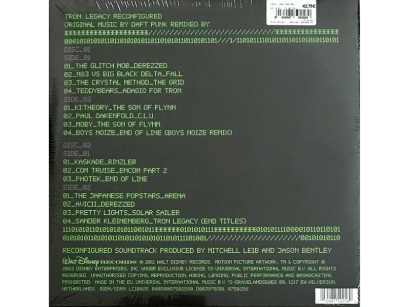 A1 Daft Punk & The Glitch Mob– Derezzed (Remixed By The Glitch Mob)A2 Daft Punk & M83, Big Black Delta– Fall (Remixed By M83 Vs. Big Black Delta)A3 Daft Punk & The Crystal Method– The Grid (Remixed By The Crystal Method)A4 Daft Punk & Teddybears*– Adagio For TRON (Remixed By Teddybears)B1 Daft Punk & Ki:Theory– The Son Of Flynn (Remixed By Ki:Theory)B2 Daft Punk & Paul Oakenfold– C.L.U. (Remixed By Paul Oakenfold)B3 Daft Punk & Moby– The Son Of Flynn (Remixed By Moby)B4 Daft Punk & Boys Noize– End Of Line (Remixed By Boys Noize)C1 Daft Punk & Kaskade– Rinzler (Remixed By Kaskade)C2 Daft Punk & Com Truise– Encom Part 2 (Remixed By Com Truise)C3 Daft Punk & Photek– End Of Line (Remixed By Photek)D1 Daft Punk & The Japanese Popstars– Arena (Remixed By The Japanese Popstars)D2 Daft Punk & Avicii– Derezzed (Remixed By Avicii)D3 Daft Punk & Pretty Lights– Solar Sailer (Remixed By Pretty Lights)D4 Daft Punk & Sander Kleinenberg– TRON Legacy (End Titles) (Remixed By Sander Kleinenberg)