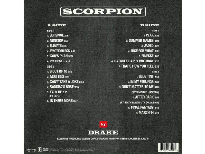 A1 SurvivalA2 NonstopA3 ElevateA4 EmotionlessA5 God's PlanA6 I'm UpsetB1 8 Out Of 10B2 Mob TiesB3 Can't Take A JokeB4 Sandra's RoseB5 Talk UpB6 Is There MoreC1 PeakC2 Summer GamesC3 JadedC4 Nice For WhatC5 FinesseC6 Ratchet Happy BirthdayC7 That's How You FeelD1 Blue TintD2 In My FeelingsD3 Don't Matter to MeD4 After DarkD5 Final FantasyD6 March 14