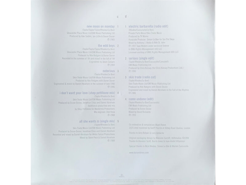 C2 The Wild Boys 4:17Engineer – Jason CorsaroProducer – Duran Duran, Nile RodgersWritten-By – Taylor*, Taylor*, Rhodes*, Taylor*, Le Bon*