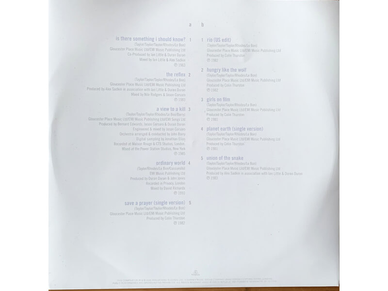 A2 The Reflex 4:24Mixed By – Jason Corsaro, Nile RodgersProducer – Alex Sadkin, Duran Duran, Ian LittleWritten-By – Taylor*, Taylor*, Rhodes*, Taylor*, Le Bon*
