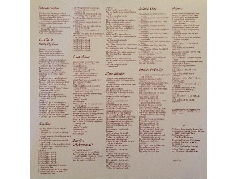 A1 Eldorado Overture 2:12A2 Can't Get It Out Of My Head 4:26A3 Boy Blue 5:19A4 Laredo Tornado 5:30A5 Poorboy (The Greenwood) 2:58B1 Mister Kingdom 5:08B2 Nobody's Child 3:57B3 Illusions In G Major 2:37B4 Eldorado 5:18B5 Eldorado Finale 1:30