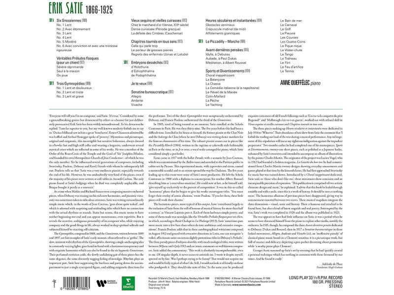 Виниловая пластинка Erik Satie, Anne Queffélec – 3 Gymnopédies, 6 Gnossiennes & other Piano works