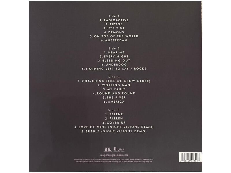 Список композиций:A1 Radioactive 3:08A2 Tiptoe 3:15A3 It’s Time 4:00A4 Demons 2:56A5 On Top Of The World 3:12A6 Amsterdam 4:05B1 Hear Me 3:53B2 Every Night 3:36B3 Bleeding Out 3:43B4 Underdog 3:28B5 Nothing Left To Say / Rocks 8:59C1 Cha-Ching (Till We Grow Older) 4:10C2 Working Man 3:55C3 My Fault 2:56C4 Round And Round 3:18C5 The River 3:26C6 America 4:35D1 Selene 4:01D2 Fallen 3:01D3 Cover Up 4:20D4 Love Of Mine (Night Visions Demo) 4:10D5 Bubble (Night Visions Demo) 3:25