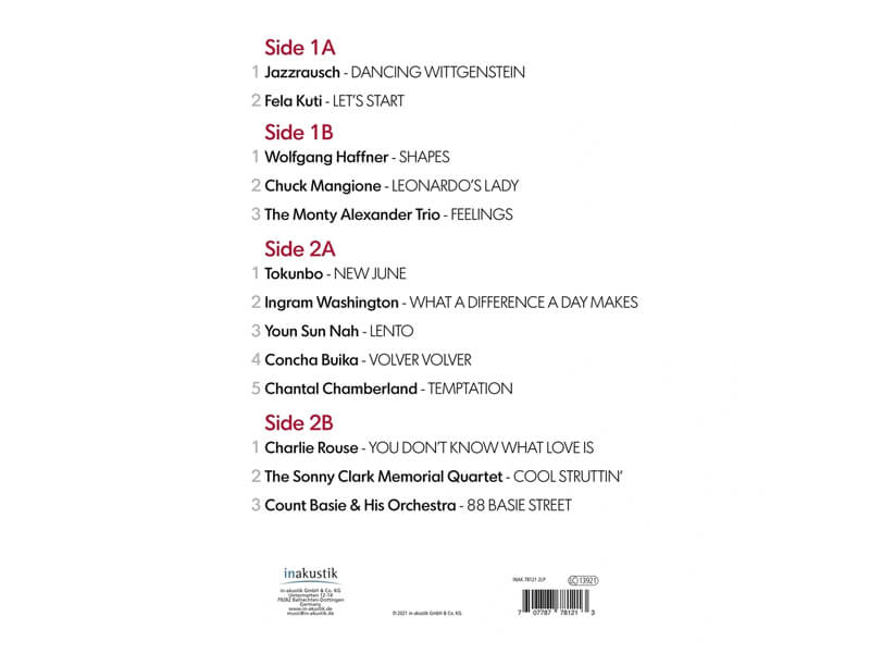 A1 Jazzrausch*– Dancing Wittgenstein 10:11A2 Fela Kuti– Let's Start 6:59B1 Wolfgang Haffner– Shapes 5:18B2 Chuck Mangione– The Feeling's Back 6:32B3 The Monty Alexander Trio– Feelings 5:35C1 Tokunbo*– New June 4:16C2 Ingram Washington– What A Difference A Day Makes 3:10C3 Youn Sun Nah– Lento 3:05C4 Concha Buika– Volver Volver 4:21C5 Chantal Chamberland– Temptation 3:32D1 Charlie Rouse– You Don't Know What Love Is 6:27D2 The Sonny Clark Memorial Quartet– Cool Struttin' 5:28D3 Count Basie & His Orchestra*– 88 Basie Street 4:48