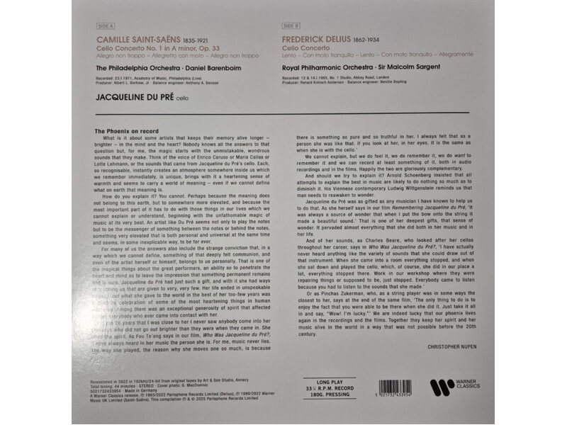 Список композиций:A1 Camille Saint-Saëns– Cello Concerto N° 1 In Minor, Op. 33Cello – Jacqueline Du PréConductor – Daniel BarenboimEngineer – Anthony A. BensonOrchestra – The Philadelphia OrchestraProducer – Albert L. Borkow, JrB1 Frederick Delius– Cello ConcertoCello – Jacqueline Du PréConductor – Sir Malcolm SargentEngineer – Neville BoylingOrchestra – Royal Philharmonic OrchestraProducer – Ronald Kinloch Anderson