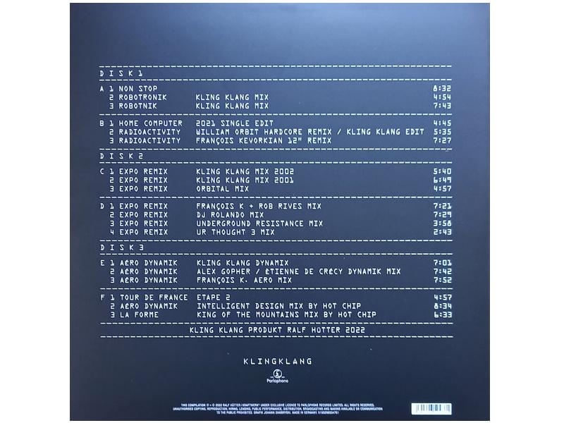A1 Non Stop 8:32A2 Robotronik (Kling Klang Mix) 4:54A3 Robotnik (Kling Klang Mix) 7:43B1 Home Computer (2021 Single Edit) 4:45B2 Radioactivity (William Orbit Hardcore Remix / Kling Klang Edit)Remix – William Orbit5:35B3 Radioactivity (François Kevorkian 12" Remix)Remix – François Kevorkian7:27C1 Expo Remix (Kling Klang Mix 2002) 5:40C2 Expo Remix (Kling Klang Mix 2001) 6:49C3 Expo Remix (Orbital Mix)Remix – Orbital4:57D1 Expo Remix (François K + Rob Rives Mix)Remix – François K*, Rob Rives7:21D2 Expo Remix (DJ Rolando Mix)Remix – DJ Rolando7:29D3 Expo Remix (Underground Resistance Mix)Remix – Underground Resistance3:58D4 Expo Remix (UR Thought 3 Mix)Remix – UR*2:43E1 Aéro Dynamik (Kling Klang Dynamix) 7:01E2 Aéro Dynamik (Alex Gopher / Ètienne De Crécy Dynamik Mix)Remix – Alex Gopher, Etienne De Crecy*7:42E3 Aéro Dynamik (François K. Aero Mix)Remix – Francois K.*7:52F1 Tour De France (Etape 2) 4:57F2 Aéro Dynamik (Intelligent Design Mix By Hot Chip)Remix – Hot Chip8:34F3 La Forme (King Of The Mountains Mix By Hot Chip)Remix – Hot Chip6:33