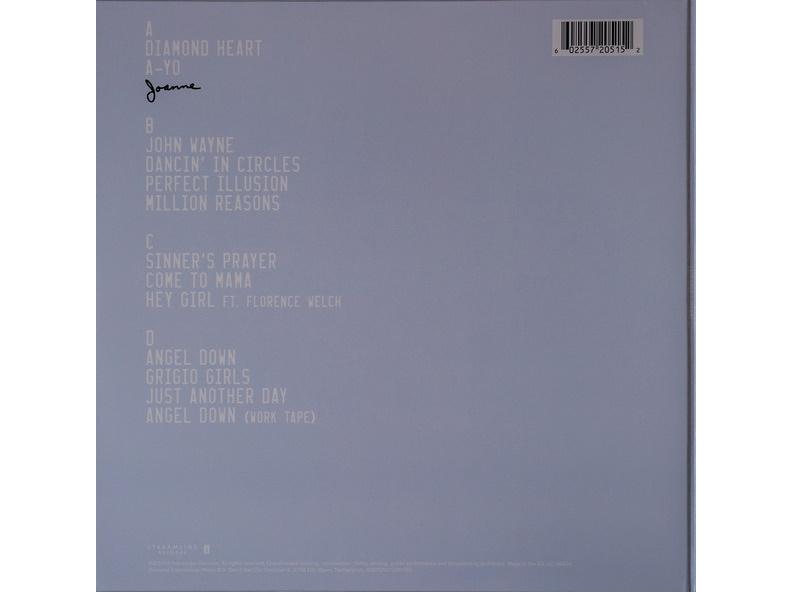 Список композиций:A1 Diamond HeartBass, Electric Piano – Mark RonsonCo-producer – Jeff Bhasker, Josh HommeDrums – Josh Tillman*, Matt HeldersGuitar – Josh HommeMixed By – Tom ElmhirstMixed By [Assistant] – Brandon Bost, Joe ViscianoPerformer [Rhythm Track] – BloodpopProducer – Bloodpop, Lady Gaga, Mark RonsonRecorded By – Joshua Blair, Justin Smith (51), Riccardo DamianRecorded By [Assistant] – David "Squirrel" Covell*Synthesizer – Jeff BhaskerWritten-By – Josh Homme, Mark Ronson, Stefani Germanotta3:30A2 A-YoBaritone Saxophone – Ian Hendrickson-SmithBass – Mark RonsonEngineer [Engineered For Mix] – John HanesGuitar – Josh Homme, Mark Ronson, Thomas BrenneckMixed By – Serban GheneaOrgan, Performer [Rhythm Track] – BloodpopPercussion – Este Haim, Lady GagaProducer – Bloodpop, Lady Gaga, Mark RonsonRecorded By – Benjamin Rice, Joshua BlairRecorded By [Assistant] – Barry McCready, David "Squirrel" Covell*, Justin Smith (51)Tenor Saxophone – J. Gastelum Cochemea*Trumpet – Brian Newman (4), Dave GuyWritten-By – Hillary Lindsey, Mark Ronson, M. Tucker*, Stefani Germanotta3:27A3 JoanneBass, Guitar, Strings [Mellotron] – Mark RonsonGuitar – Harper SimonKeyboards – Bloodpop, Mark RonsonMixed By – Tom ElmhirstMixed By [Assistant] – Brandon Bost, Joe ViscianoPercussion – Lady GagaPerformer [Rhythm Track] – BloodpopProducer – Bloodpop, Lady Gaga, Mark RonsonRecorded By – Dave Russell, Joshua Blair, Justin Smith (51)Recorded By [Assistant] – David "Squirrel" Covell*, Johnnie BurikWritten-By – Mark Ronson, Stefani Germanotta3:16B1 John WayneBass – Mark RonsonDrums – Josh HommeGuitar – Josh Homme, Mark RonsonMixed By – Tom ElmhirstMixed By [Assistant] – Brandon Bost, Joe ViscianoPerformer [Rhythm Track], Synthesizer – BloodpopProducer – Bloodpop, Lady Gaga, Mark RonsonRecorded By – Joshua BlairRecorded By [Assistant] – Barry McCready, Charley Pollard*, David "Squirrel" Covell*, Justin Smith (51)Written-By – Josh Homme, Mark Ronson, M. Tucker*, Stefani Germanotta2:54B2 Dancin' In CirclesEngineer [Engineered For Mix] – John HanesGuitar – Mark RonsonMixed By – Serban GheneaPerformer [Rhythm Track], Synthesizer – BloodpopProducer – Bloodpop, Lady Gaga, Mark RonsonRecorded By – Joshua BlairRecorded By [Assistant] – Barry McCready, David "Squirrel" Covell*Written-By – Beck Hansen, Mark Ronson, M. Tucker*, Stefani Germanotta3:27B3 Perfect IllusionBass – BloodpopDrums – Kevin Parker (2)Engineer [Engineered For Mix] – John HanesGuitar – Josh Homme, Kevin Parker (2), Mark RonsonMixed By – Serban GheneaPerformer [Rhythm Track] – BloodpopProducer – Bloodpop, Kevin Parker (2), Lady Gaga, Mark RonsonRecorded By – Joshua BlairRecorded By [Assistant] – Barry McCready, David "Squirrel" Covell*, Justin Smith (51)Synthesizer – Bloodpop, Kevin Parker (2), Mark RonsonWritten-By – Kevin Parker (2), Mark Ronson, M. Tucker*, Stefani Germanotta3:02B4 Million ReasonsBass – Mark RonsonGuitar – Hillary Lindsey, Mark RonsonKeyboards, Performer [Rhythm Track], Programmed By [String Programming] – BloodpopMixed By – Tom ElmhirstMixed By [Assistant] – Brandon Bost, Joe ViscianoPiano – Lady GagaProducer – Bloodpop, Lady Gaga, Mark RonsonRecorded By – Brandon Bost, Joe Visciano, Joshua BlairRecorded By [Assistant] – Barry McCready, David "Squirrel" Covell*Vocals [Additional] – Hillary LindseyWritten-By – Hillary Lindsey, Mark Ronson, Stefani Germanotta3:25C1 Sinner's PrayerBacking Vocals – Hillary LindseyBass – Nick MovshonDrums – Homer SteinweissGuitar – Thomas BrenneckKeyboards, Mellotron – Leon MichelsMixed By – Tom ElmhirstMixed By [Assistant] – Brandon Bost, Joe ViscianoPiano – Victor AxelrodProducer – Bloodpop, Lady Gaga, Mark RonsonRecorded By – Jens Jungkurth, Joshua Blair, Justin Smith (51), Matthew CullenRecorded By [Assistant] – Abby Echiverri, David "Squirrel" Covell*, Ed McEnteeSlide Guitar – Josh Homme, Sean LennonSynthesizer, Performer [Rhythm Track] – BloodpopWritten-By – Josh Tillman*, Mark Ronson, Stefani Germanotta, Thomas Brenneck3:43C2 Come To MamaBaritone Saxophone, Tenor Saxophone, Alto Saxophone – James KingBass, Guitar – Mark RonsonDrums – Brent Kolatalo, Ken LewisDrums, Synthesizer [Additional Synths] – Emile HaynieMixed By – Tom ElmhirstMixed By [Assistant] – Brandon Bost, Joe ViscianoPiano, Backing Vocals – Lady GagaProducer – Bloodpop, Emile Haynie, Lady Gaga, Mark RonsonProgrammed By [Synthesizer] – BloodpopRecorded By – Brent Kolatalo, Joshua Blair, Ken LewisRecorded By [Assistant] – Barry McCready, David "Squirrel" Covell*Written-By – Emile Haynie, Josh Tillman*, Stefani Germanotta4:15C3 Hey GirlBass – Nick MovshonCello – Kelsey LuDrums – Homer SteinweissFeaturing – Florence WelchGuitar – Jack Byrne (3), Thomas BrenneckHarp – Tom MothMixed By – Tom ElmhirstMixed By [Assistant] – Brandon Bost, Joe ViscianoPerformer [Rhythm Track] – BloodpopPiano – Lady GagaProducer – Bloodpop, Lady Gaga, Mark RonsonRecorded By – Brett "123" Shaw*, Jens Jungkurth, Joshua BlairRecorded By [Assistant] – Chris Claypool, Christopher Cerullo, David "Squirrel" Covell*, Michael Harris (10)Synthesizer – Victor AxelrodVocals – Florence WelchWritten-By – Florence Welch, Mark Ronson, Stefani Germanotta4:15D1 Angel DownDrums, Keyboards – BloodpopMixed By – Ben BaptiePiano – Lady GagaProducer – Bloodpop, Lady Gaga, Mark RonsonRecorded By – David "Squirrel" Covell*, Joshua BlairRecorded By [Assistant] – Barry McCready, Justin Smith (51)Strings [Mellotron] – Mark RonsonWritten-By – Nadir Khayat, Stefani Germanotta3:49Bonus TracksD2 Grigio GirlsBass – Mark RonsonGuitar – Anthony RossomandoMixed By – Tom ElmhirstMixed By [Assistant] – Brandon Bost, Joe ViscianoPerformer [Rhythm Track], Synthesizer – BloodpopProducer – Bloodpop, Lady Gaga, Mark RonsonRecorded By –