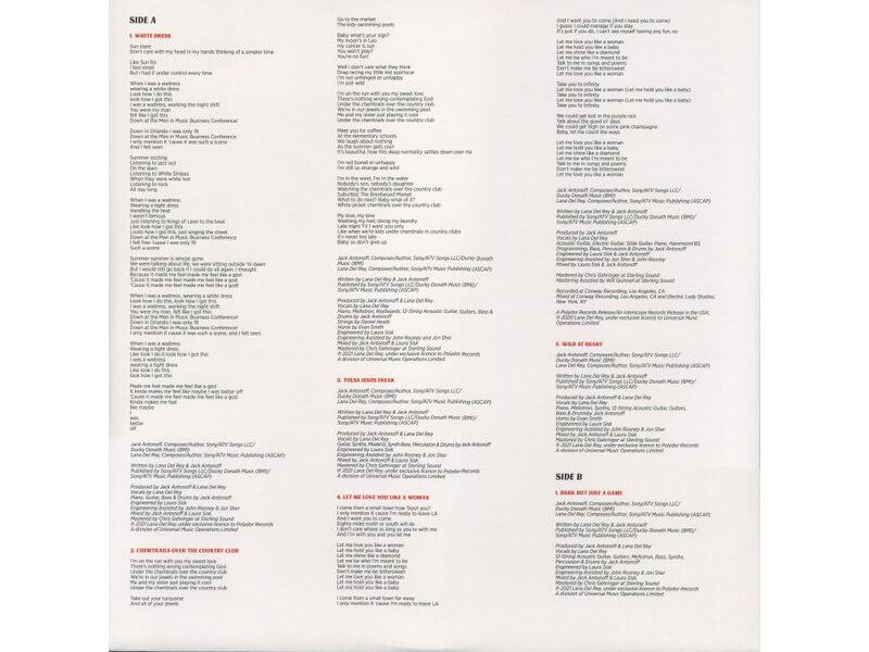 A4 Let Me Love You Like A Woman 3:21Acoustic Guitar, Electric Guitar, Slide Guitar, Piano, Piano [Hammond B3], Programmed By, Bass, Percussion, Drums – Jack AntonoffEngineer – Jack Antonoff, Laura SiskEngineer [Assisted] – John Rooney (10), Jon SherMastered By – Chris GehringerMastered By [Assisted] – Will QuinnellMixed By – Jack Antonoff, Laura SiskVocals – Lana Del ReyWritten-By – Lana Del ReyWritten-By, Producer – Jack Antonoff