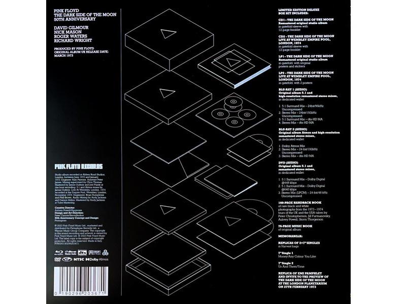 Этот сет также включает эксклюзивный постер и уникальное оформление, что делает его привлекательным для коллекционеров и поклонников группы.Список композиций:CD1-1 Speak To Me 1:12CD1-2 Breathe (In The Air) 2:46CD1-3 On The Run 3:33CD1-4 Time 7:06CD1-5 The Great Gig In The Sky 4:44CD1-6 Money 6:22CD1-7 Us And Them 7:50CD1-8 Any Colour You Like 3:26CD1-9 Brain Damage 3:50CD1-10 Eclipse 2:09The Dark Side Of The Moon Live At Wembley Empire Pool, London, 1974CD2-1 Speak To Me 2:46CD2-2 Breathe (In The Air) 2:51CD2-3 On The Run 5:09CD2-4 Time 6:32CD2-5 The Great Gig In The Sky 6:50CD2-6 Money 8:41CD2-7 Us And Them 8:10CD2-8 Any Colour You Like 8:11CD2-9 Brain Damage 3:44CD2-10 Eclipse 2:19Remastered Original Studio AlbumLP1-A1 Speak To Me 1:11LP1-A2 Breathe (In The Air) 2:46LP1-A3 On The Run 3:33LP1-A4 Time 7:05LP1-A5 The Great Gig In The Sky 4:44LP1-B1 Money 6:22LP1-B2 Us And Them 7:50LP1-B3 Any Colour You Like 3:25LP1-B4 Brain Damage 3:50LP1-B5 Eclipse 2:08The Dark Side Of The Moon Live At Wembley Empire Pool, London, 1974LP2-C1 Speak To Me 2:46LP2-C2 Breathe (In The Air) 2:51LP2-C3 On The Run 5:08LP2-C4 Time 6:31LP2-C5 The Great Gig In The Sky 6:56LP2-D1 Money 6:31LP2-D2 Us And Them 8:09LP2-D3 Any Colour You Like 6:21LP2-D4 Brain Damage 3:43LP2-D5 Eclipse 2:04Original Album 5.1 Surround Mix – 24bit/96kHz UncompressedBD-1.1.1 Speak To Me 1:08BD-1.1.2 Breathe (In The Air) 2:49BD-1.1.3 On The Run 3:34BD-1.1.4 Time 7:04BD-1.1.5 The Great Gig In The Sky 4:44BD-1.1.6 Money 6:17BD-1.1.7 Us And Them 7:57BD-1.1.8 Any Colour You Like 3:25BD-1.1.9 Brain Damage 3:52BD-1.1.10 Eclipse 2:14Original Album Stereo Mix – 24bit/192kHz UncompressedBD-1.2.1 Speak To Me 1:08BD-1.2.2 Breathe (In The Air) 2:49BD-1.2.3 On The Run 3:34BD-1.2.4 Time 7:04BD-1.2.5 The Great Gig In The Sky 4:44BD-1.2.6 Money 6:17BD-1.2.7 Us And Them 7:57BD-1.2.8 Any Colour You Like 3:25BD-1.2.9 Brain Damage 3:52BD-1.2.10 Eclipse 2:14Original Album 5.1 Surround Mix – dts-HD MABD-1.3.1 Speak To Me 1:08BD-1.3.2 Breathe (In The Air) 2:49BD-1.3.3 On The Run 3:34BD-1.3.4 Time 7:04BD-1.3.5 The Great Gig In The Sky 4:44BD-1.3.6 Money 6:17BD-1.3.7 Us And Them 7:57BD-1.3.8 Any Colour You Like 3:25BD-1.3.9 Brain Damage 3:52BD-1.3.10 Eclipse 2:14Original Album Stereo Mix – dts-HD MABD-1.4.1 Speak To Me 1:08BD-1.4.2 Breathe (In The Air) 2:49BD-1.4.3 On The Run 3:34BD-1.4.4 Time 7:04BD-1.4.5 The Great Gig In The Sky 4:44BD-1.4.6 Money 6:17BD-1.4.7 Us And Them 7:57BD-1.4.8 Any Colour You Like 3:25BD-1.4.9 Brain Damage 3:52BD-1.4.10 Eclipse 2:14Original Newly Remastered Album Atmos Dolby Atmos MixBD-2.1.1 Speak To Me 1:08BD-2.1.2 Breathe (In The Air) 2:48BD-2.1.3 On The Run 3:35BD-2.1.4 Time 7:04BD-2.1.5 The Great Gig In The Sky 4:44BD-2.1.6 Money 6:17BD-2.1.7 Us And Them 7:47BD-2.1.8 Any Colour You Like 3:28BD-2.1.9 Brain Damage 3:50BD-2.1.10 Eclipse 2:23Original Album Stereo Mix – 24-bit/192kHz UncompressedBD-2.2.1 Speak To Me 1:08BD-2.2.2 Breathe (In The Air) 2:48BD-2.2.3 On The Run 3:35BD-2.2.4 Time 7:04BD-2.2.5 The Great Gig In The Sky 4:44BD-2.2.6 Money 6:17BD-2.2.7 Us And Them 7:47BD-2.2.8 Any Colour You Like 3:28BD-2.2.9 Brain Damage 3:50BD-2.2.10 Eclipse 2:23Original Album Stereo Mix – dts-HD MABD-2.3.1 Speak To Me 1:08BD-2.3.2 Breathe (In The Air) 2:48BD-2.3.3 On The Run 3:35BD-2.3.4 Time 7:04BD-2.3.5 The Great Gig In The Sky 4:44BD-2.3.6 Money 6:17BD-2.3.7 Us And Them 7:47BD-2.3.8 Any Colour You Like 3:28BD-2.3.9 Brain Damage 3:50BD-2.3.10 Eclipse 2:23Original Album 5.1 Surround Mix – Dolby Digital @448 KbpsDVD-1.1.1 Speak To Me 1:06DVD-1.1.2 Breathe (In The Air) 2:52DVD-1.1.3 On The Run 3:33DVD-1.1.4 Time 7:04DVD-1.1.5 The Great Gig In The Sky 4:45DVD-1.1.6 Money 6:16DVD-1.1.7 Us And Them 7:56DVD-1.1.8 Any Colour You Like 3:24DVD-1.1.9 Brain Damage 3:50DVD-1.1.10 Eclipse 2:17Original Album 5.1 Surround Mix – Dolby Digital @640 KbpsDVD-1.2.1 Speak To Me 1:06DVD-1.2.2 Breathe (In The Air) 2:52DVD-1.2.3 On The Run 3:33DVD-1.2.4 Time 7:04DVD-1.2.5 The Great Gig In The Sky 4:45DVD-1.2.6 Money 6:16DVD-1.2.7 Us And Them 7:56DVD-1.2.8 Any Colour You Like 3:24DVD-1.2.9 Brain Damage 3:50DVD-1.2.10 Eclipse 2:17Original Album Stereo Mix (LPCM) – 24-bit/48 kHz UncompressedDVD-1.3.1 Speak To Me 1:06DVD-1.3.2 Breathe (In The Air) 2:52DVD-1.3.3 On The Run 3:33DVD-1.3.4 Time 7:04DVD-1.3.5 The Great Gig In The Sky 4:45DVD-1.3.6 Money 6:16DVD-1.3.7 Us And Them 7:56DVD-1.3.8 Any Colour You Like 3:24DVD-1.3.9 Brain Damage 3:50DVD-1.3.10 Eclipse 2:17Money / Any Colour You Like7"-A Money 4:017"-B Any Colour You Like 3:13Us And Them / Time7"-C Us And Them 3:167"-D Time 3:33