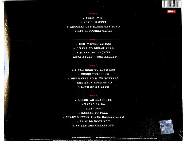 A1 Tear It Up,A2 Now I'm Here,A3 Another One Bites The Dust,A4 Fat Bottomed Girls,B1 Don't Stop Me Now,B2 I Want To Break Free,B3 Somebody To Love,B4 Love Kills - The Ballad,C1 I Was Born To Love You,C2 Under Pressure,C3 Who Wants To Live Forever,C4 The Show Must Go On,C5 Love Of My Life,D1 Bohemian Rhapsody,D2 Radio Ga Ga,D3 Ay-Ohs,D4 Hammer To Fall,D5 Crazy Little Thing Called Love,D6 We Will Rock You,D7 We Are The Champions