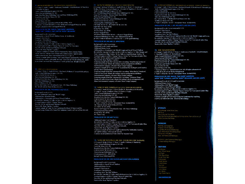 A8 Another Part Of MeBacking Vocals – Cocoa Sarai, K.A.A.N., Russ (15)Engineer [Assistant Engineer] – Jeffery "Champ" Massey*, Victor "Vic" Luevanos*Featuring – StingGuitar, Bass – Erik "Blu2th" Griggs*, StingKeyboards [Additional Keys], Percussion [Additional Percussion] – Dem Jointz, Focus...*, FredWreck*Producer – Dr. Dre, The ICURecorded By – Martin Kierszenbaum, Quentin "Q" Gilkey*, Tony LakeVocals [Additional Vocals] – Dem Jointz, Dr. DreWritten-By – A. Young*, B. Edwards, Jr.*, B. Perry*, D. Balfour*, D. Abernathy, Jr.*, E. Griggs*, F. Nassar*, G. Sumner*, R. Vitale*, S. Jordan*, T. Myrie*, V. Smith*, Y. Koffi*