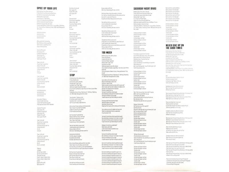 A5 Never Give Up On The Good Times 4:30Arranged By [Strings] – Anne DudleyBass Guitar – Steve Lewison*Engineer [Additional] – Jake DaviesFlute – Snake DavisGuitar – Shawn LeeKeyboards, Programmed By – Matt RoweMixed By – Mark "Spike" Stent*Mixed By [Assistant] – Paul "P-Dub" Walton*Producer – Matt Rowe, Richard StannardProgrammed By [Additional] – Magnus Fiennes, Pete DavisRecorded By, Engineer – Adrian BushbyWritten-By – Rowe*, Stannard*, Spice Girls