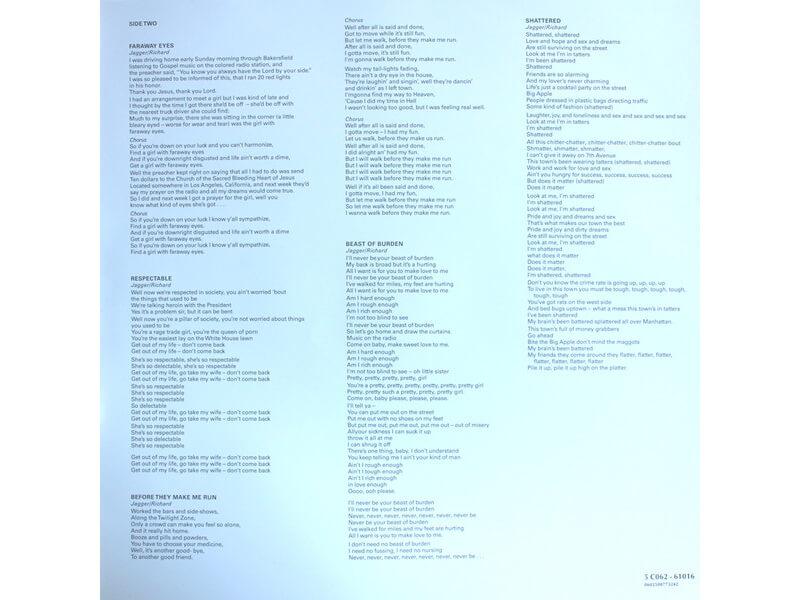 B5 ShatteredBass Guitar, Lead Guitar, Bass Drum [O/D Bass Drum] – Ron WoodElectric Guitar [O/D Electric Guitar (in solo)] – Keith RichardsPercussion – 1 Jew, 1 Moroccan, 1 WaspTom Tom [O/D Tom-Tom] – Charlie Watts