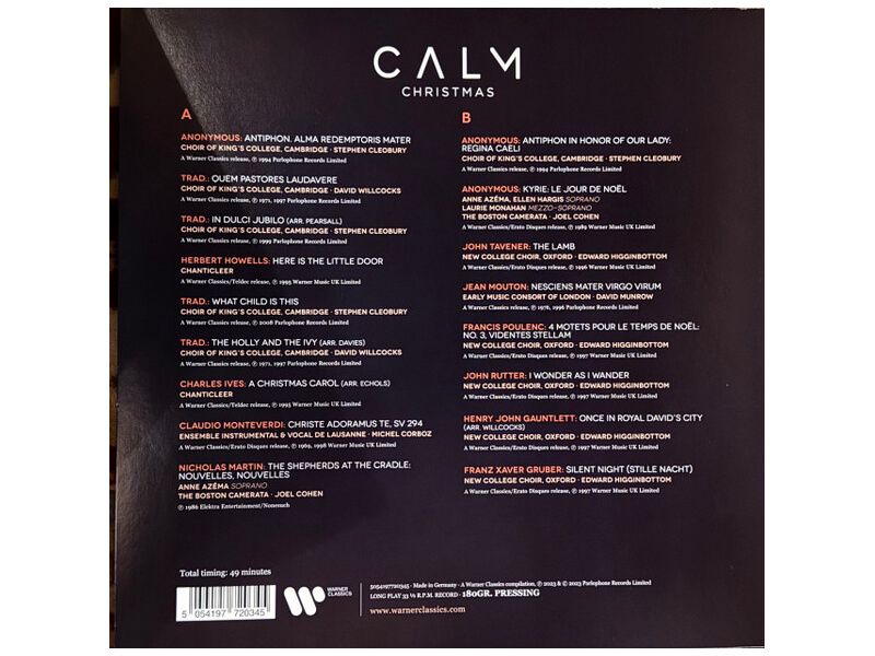 Список композиций:A1 The King's College Choir Of Cambridge– Antiphon. "Alma Redemptoris Mater"Conductor – Stephen CleoburyA2 The King's College Choir Of Cambridge– Quem Pastores LaudavereConductor – David WillcocksA3 The King's College Choir Of Cambridge– In Dulci JubiloConductor – Stephen CleoburyA4 Chanticleer– Here Is The Little DoorComposed By – Herbert HowellsA5 The King's College Choir Of Cambridge– What Child Is ThisConductor – Stephen CleoburyA6 The King's College Choir Of Cambridge– The Holly And The IvyConductor – David WillcocksA7 Chanticleer– A Christmas CarolArranged By – Paul C. EcholsComposed By – Charles IvesA8 Ensemble Instrumental De Lausanne, Ensemble Vocal De Lausanne– Christe Adoramus Te, SV 294Composed By – Claudio MonteverdiConductor – Michel CorbozA9 Boston Camerata– The Shepherds At The Cradle: Nouvelles, NouvellesComposed By – Nicolas Martin (3)Conductor – Joel Cohen (3)Soprano Vocals – Anne AzémaB1 The King's College Choir Of Cambridge– Antiphon in Honor of Our Lady. "Regina caeli"Conductor – Stephen CleoburyB2 Boston Camerata– Kyrie: Le Jour De NoelConductor – Joel Cohen (3)Mezzo-soprano Vocals – Laurie MonahanSoprano Vocals – Anne Azéma, Ellen HargisB3 The New College Oxford Choir– The LambComposed By – John TavenerConductor – Edward HigginbottomB4 The Early Music Consort Of London– Nesciens Mater Virgo VirumComposed By – Jean MoutonConductor – David MunrowB5 The New College Oxford Choir– 4 Motets Pour Le Temps De Noel: No. 3, Videntes StellamComposed By – Francis PoulencConductor – Edward HigginbottomB6 The New College Oxford Choir– I Wonder As I WanderComposed By – John RutterConductor – Edward HigginbottomB7 The New College Oxford Choir– Once In Royal David's CityComposed By – Henry J. GauntlettConductor – Edward HigginbottomB8 The New College Oxford Choir– Silent Night (Stille Nacht)Composed By – Franz GruberConductor – Edward Higginbottom