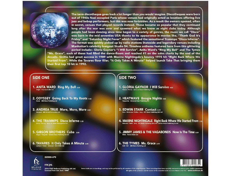 A1 Anita Ward– Ring My Bell 3:30A2 Odyssey (2)– Going Back To My Roots 3:56A3 Andrea True Connection– More, More, More 3:04A4 The Trammps– Disco Inferno 3:38A5 Gibson Brothers– Cuba 3:50A6 Tavares– It Only Takes A Minute 3:25B1 Gloria Gaynor– I Will Survive 4:55B2 Heatwave– Boogie Nights 3:40B3 Edwin Starr– Contact 3:19B4 Maxine Nightingale– Right Back Where We Started From 3:10B5 Jimmy James & The Vagabonds– Now Is The Time 3:39B6 The Tymes– Ms. Grace 3:19